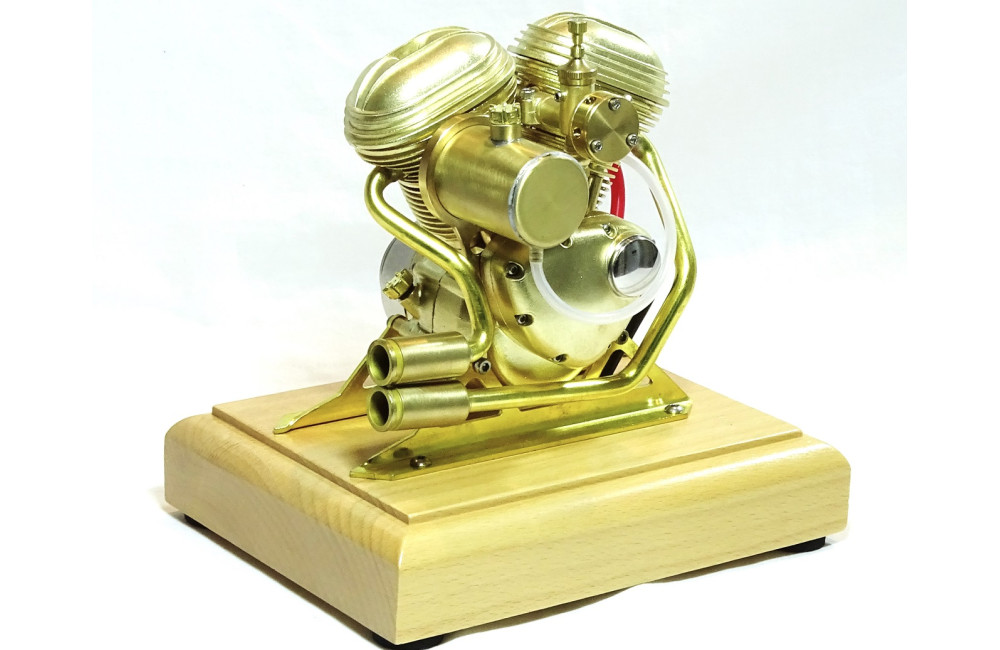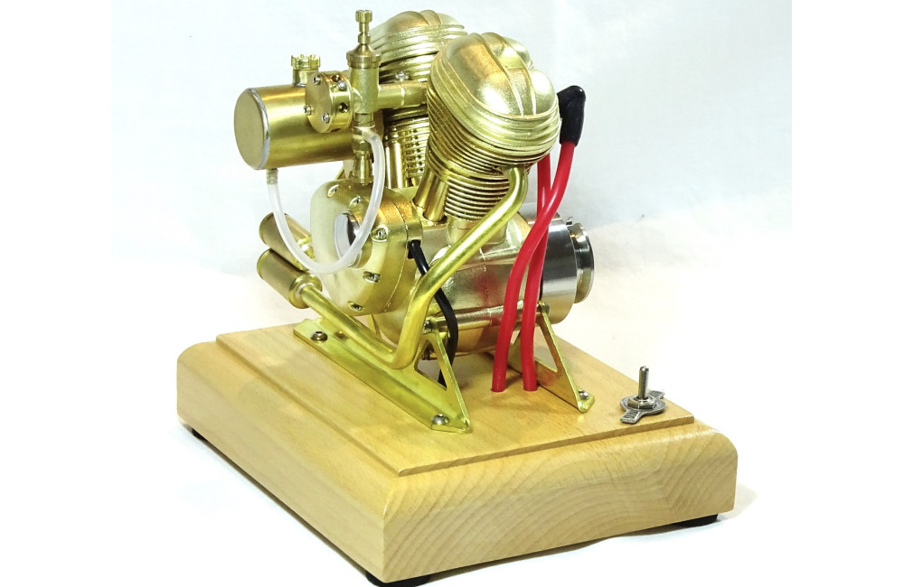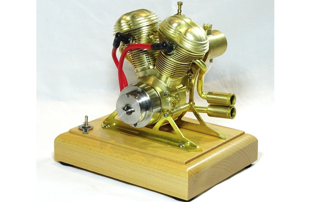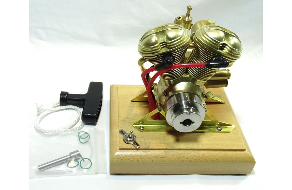 The model internal combustion (IC) engine is made by Microcosm, China and is a working (1:5 scale) gasoline/petrol 4 stoke engine based on a V twin cylinder OHV motorcycle engine.