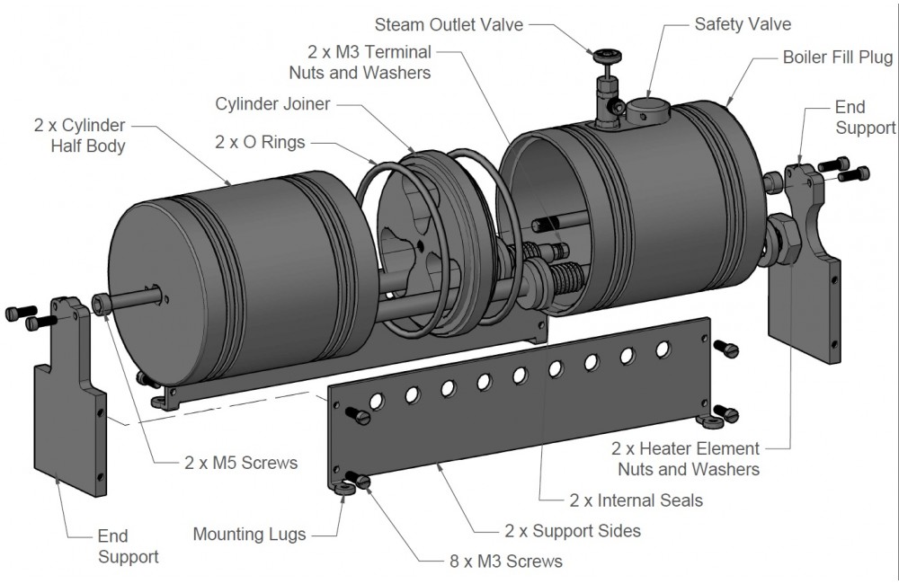 The boiler cylinders are provided complete and tested (certificate provided), the base is a kit of fully machined, unpainted parts that can be easily assembled with simple tools.