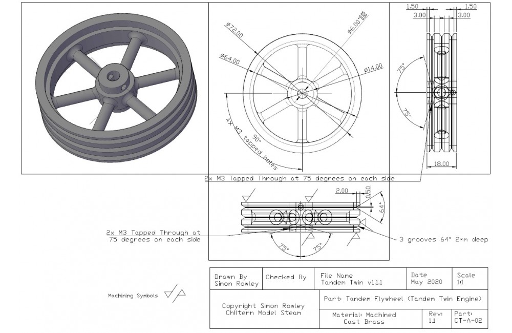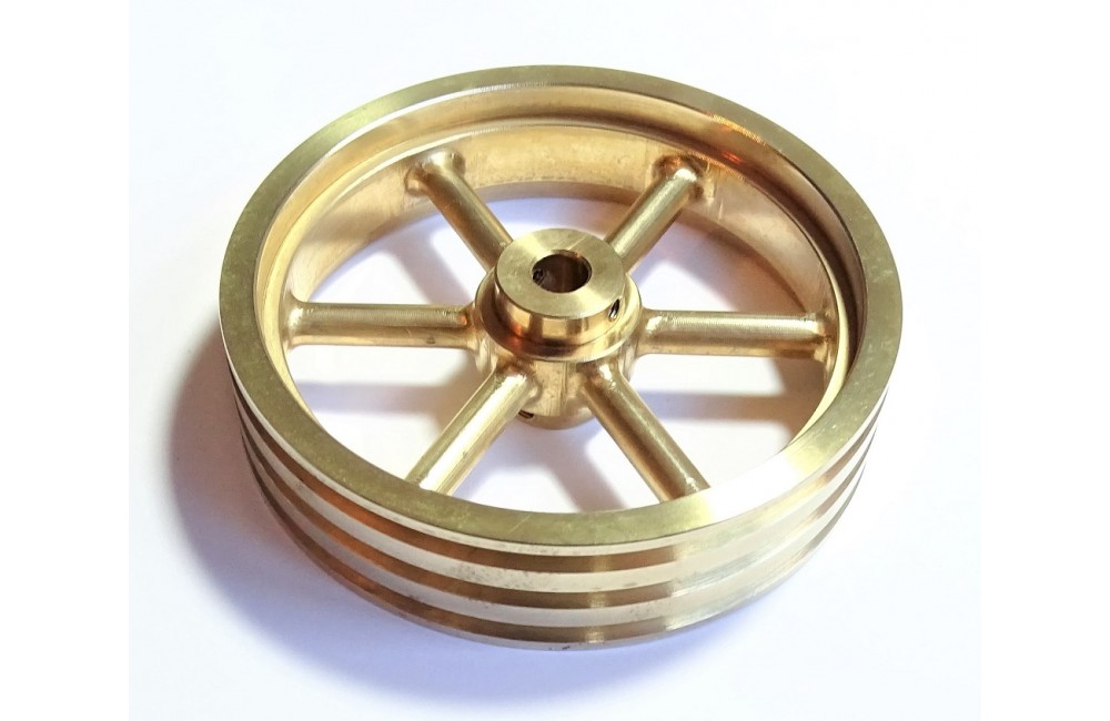 The large wide brass pulley/flywheel is fully machined with 3 slots for O ring belts and can be used on our or other model engines as required.